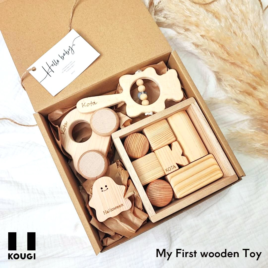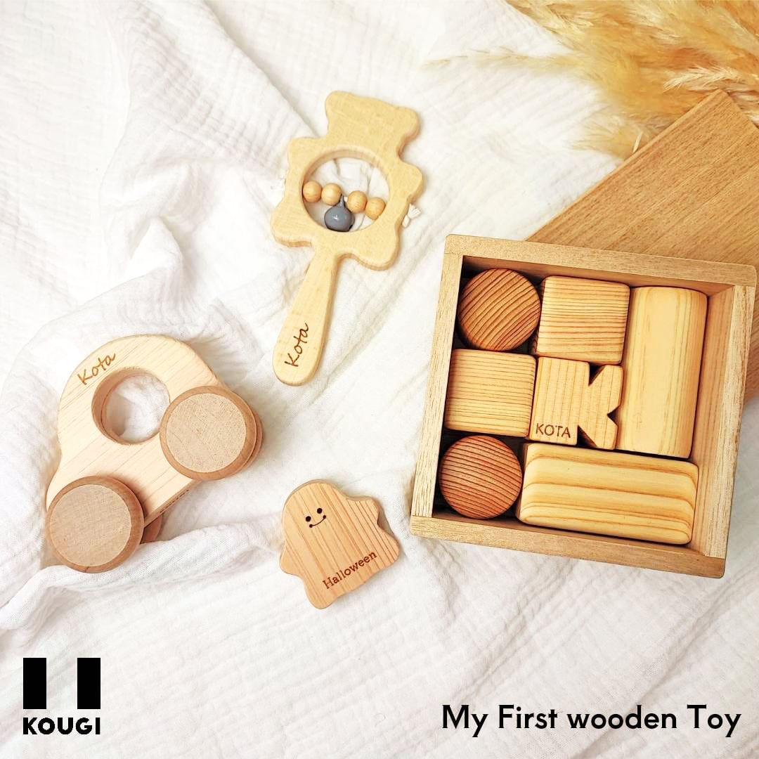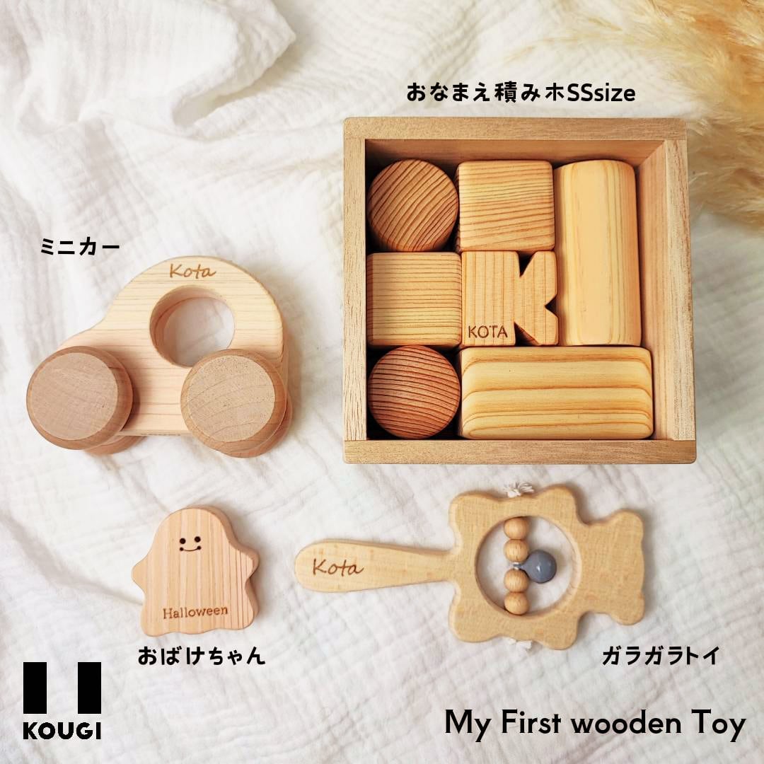 『ハロウィン仕様のベビー木製おもちゃ名入れ4点セット』